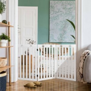 36 Inch Folding Wooden Freestanding Pet Gate Dog Gate with 360?° Flexible Hinge-White – Color: White