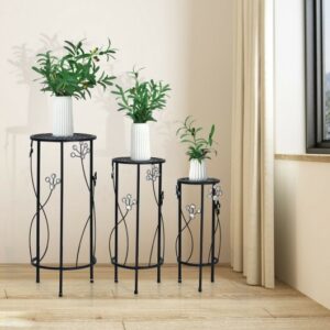 3 Pieces Metal Plant Stand Set with Crystal Floral Accents Round-Black – Color: Black