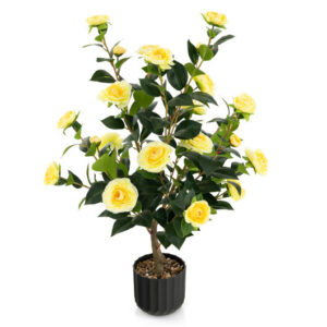 38 Inch Artificial Camellia Tree Faux Flower Plant in Cement Pot-Yellow – Color: Yellow